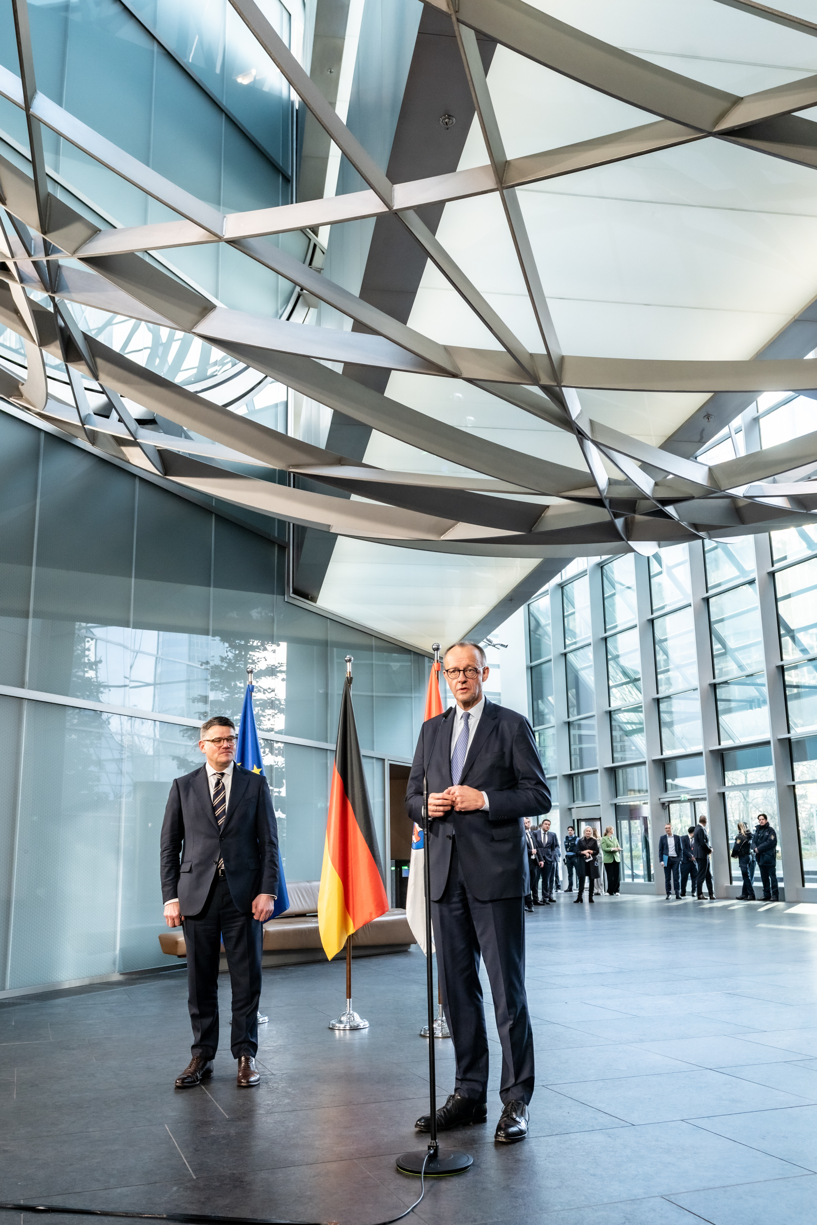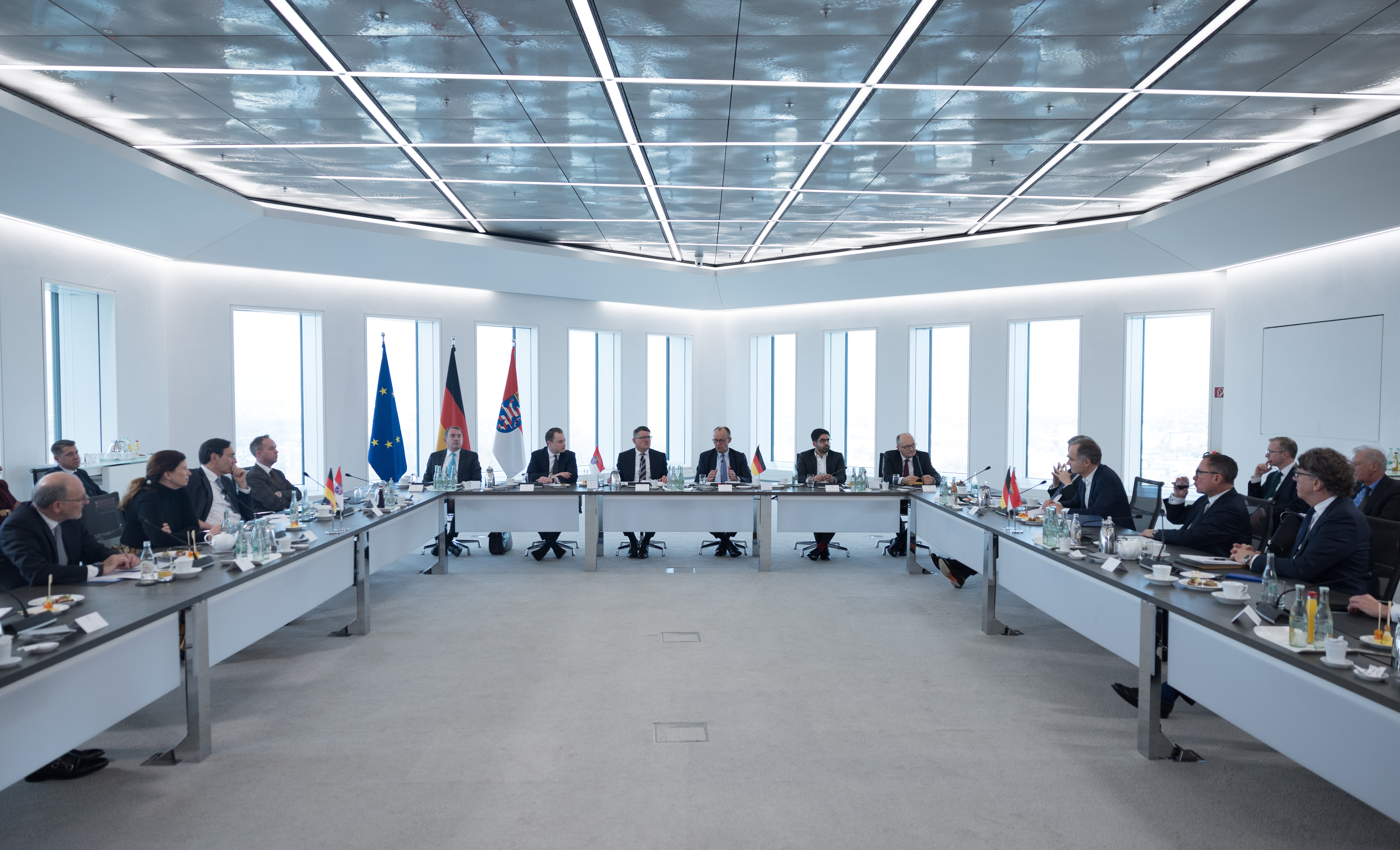 In Frankfurt sagte Rhein: „Wir sind die zentrale Drehscheibe für den Luftverkehr, für Kapital und für Daten. Für den Luftverkehr – mit dem Frankfurter Flughafen. Für Kapital – mit Europas Finanzplatz Nummer eins in Frankfurt. Und für Daten – mit unseren Rechenzentren und DE-CIX, dem größten Internetknotenpunkt der Welt.“ Der Besuch des Kanzlers sei ein starkes Zeichen für die vertrauensvolle Zusammenarbeit zwischen Bund und Ländern, sagte der hessische Regierungschef und fügte hinzu: „Ich freue mich, Bundeskanzler Friedrich Merz in Hessen willkommen heißen zu dürfen. Der Besuch ist eine große Ehre für uns. Die neue Bundesregierung hat an vielen Stellen eine Renaissance der Realpolitik eingeleitet. Ich danke dem Bundeskanzler, dass er Deutschland trotz aller innen- und außenpolitischen Herausforderungen wieder auf Kurs gebracht hat. Dank seiner Politik sind wir wieder Spieler auf der Weltbühne, statt Spielball anderer auf der Welt.“